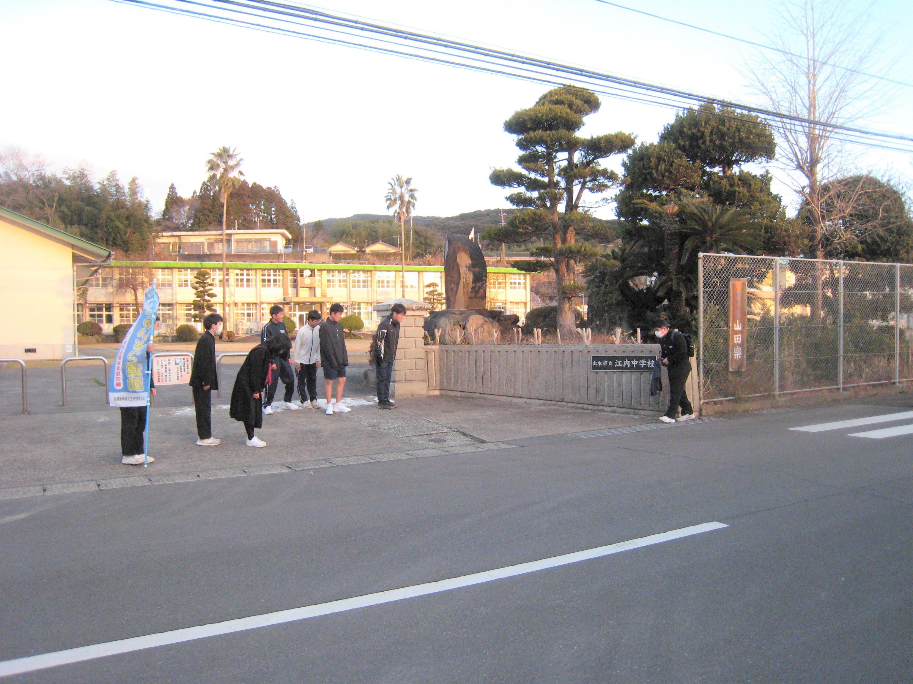 本校では生徒会役員が定期的にあいさつ運動を行っています。また,毎月,江内小学校と合同でのあいさつ運動も行っています。
